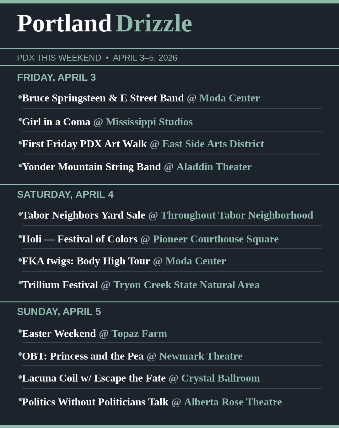 👯Friday, my Friends! It's a mild one — 58 degrees, mostly dry. The weekend ahead is the kind of April weather that makes you forgive the prior six months. Saturday hits 69. Sunday touches 75. Go outside. You've earned it. In the news: City Hall moved to cut a break for small businesses, East Portland’s food desert problem grows, and maybe just don’t read the third article if you don’t want to be sad.