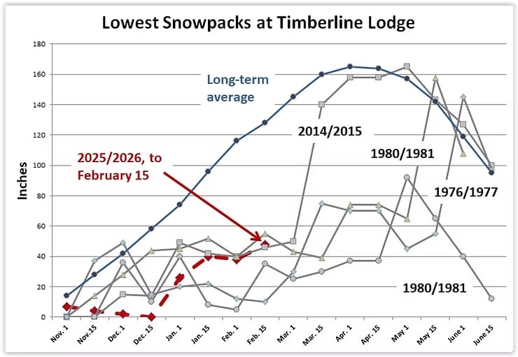 It's March and Oregon's snowpack is tracking toward one of the worst years ever recorded. The mountains that are supposed to be storing water for the summer — the same mountains that feed rivers, farms, and reservoirs — are running dangerously low. Fire officials are already war-gaming a brutal summer, and water managers aren't exactly sleeping well either. The dry winter that felt kind of nice in January is looking a lot less charming now that the consequences are coming into focus. Enjoy the rain today, Portland. You might miss it by July.