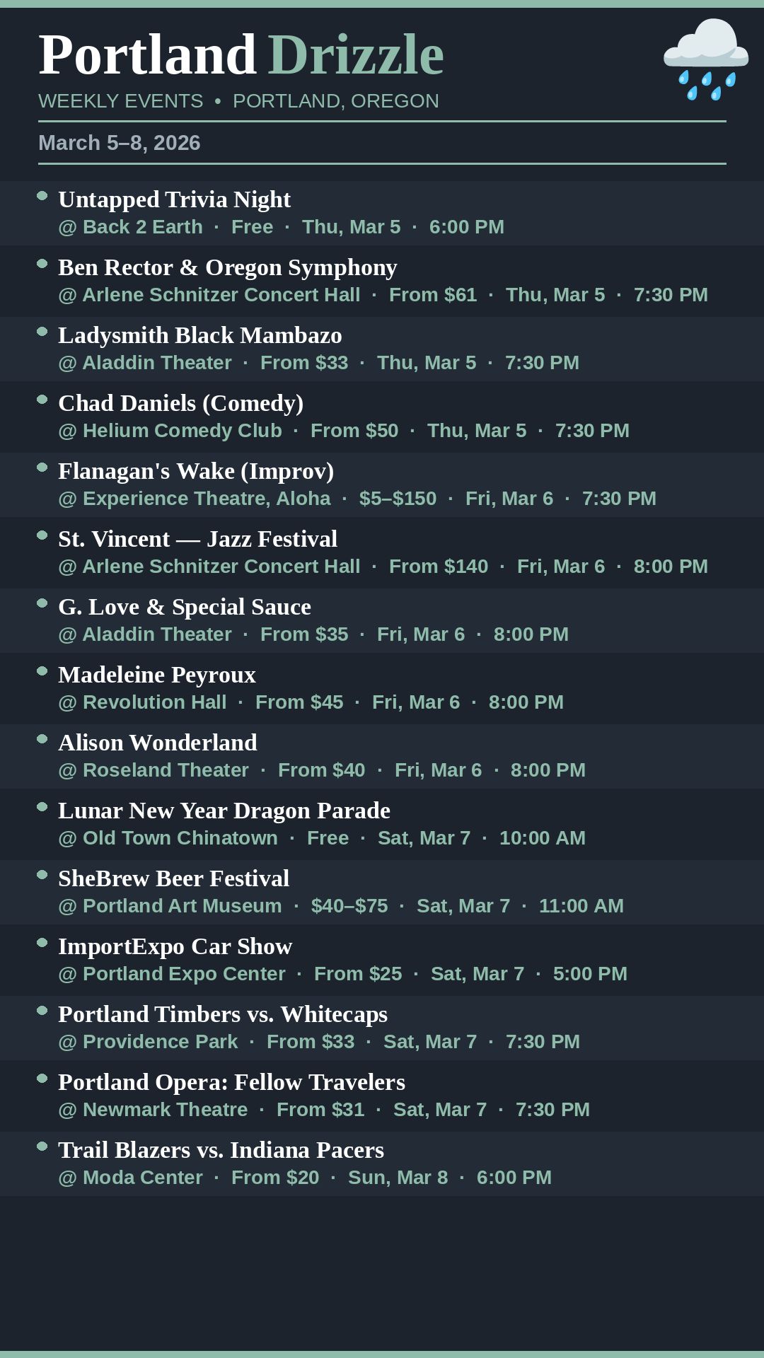 Cool and damp, high of 53°F — classic early March in the Rose City. AccuWeather shows a high of 53° and a low of 46° today. Pack a jacket if you're headed out tonight. The Oregon Legislature is in its final days, and the Moda Center funding bill is headed to the House. Big weekend ahead.
